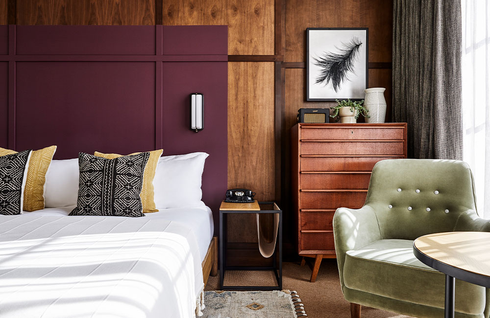 Discover the 119 boutique hotel rooms that range in size on offer at our Oregon location. Every room features rich walnut panelling, mid-century touches, artwork curated by local Portland gallerist, Upfor, and ceramics by Clay Factor. Enjoy a slice of luxury as you settle down after a day [or night!] of exploring everything the heart of Oregon has to offer.