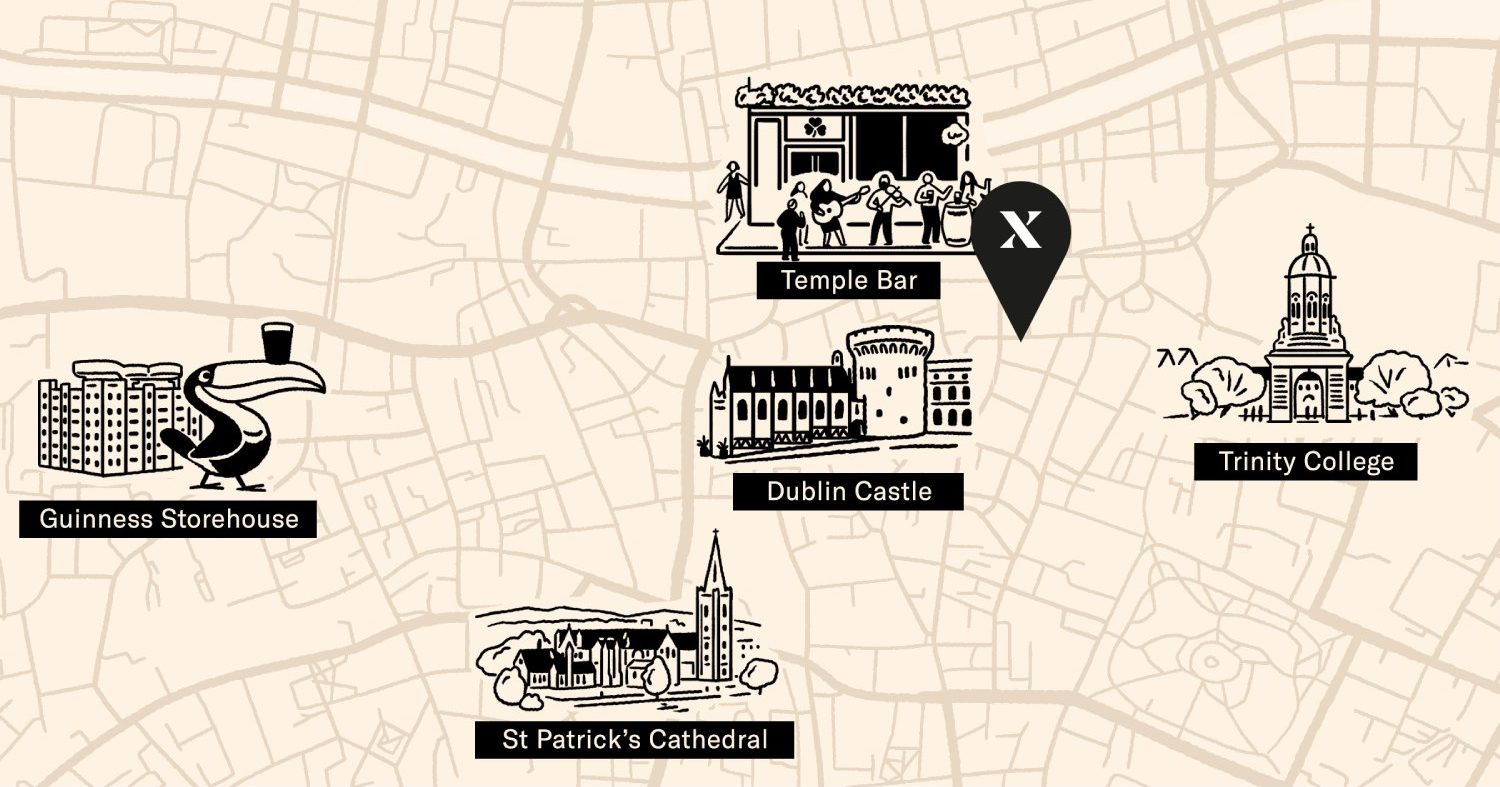 Tucked away in a historic building on bustling Exchequer Street, our Dublin home sets you at the cultural heart of the city. Just minutes from must-see attractions, it’s where Georgian architecture and world-class dining, centuries-old pubs and indie bookshops meet cobbled lanes, artisan coffee shops and hidden bars.